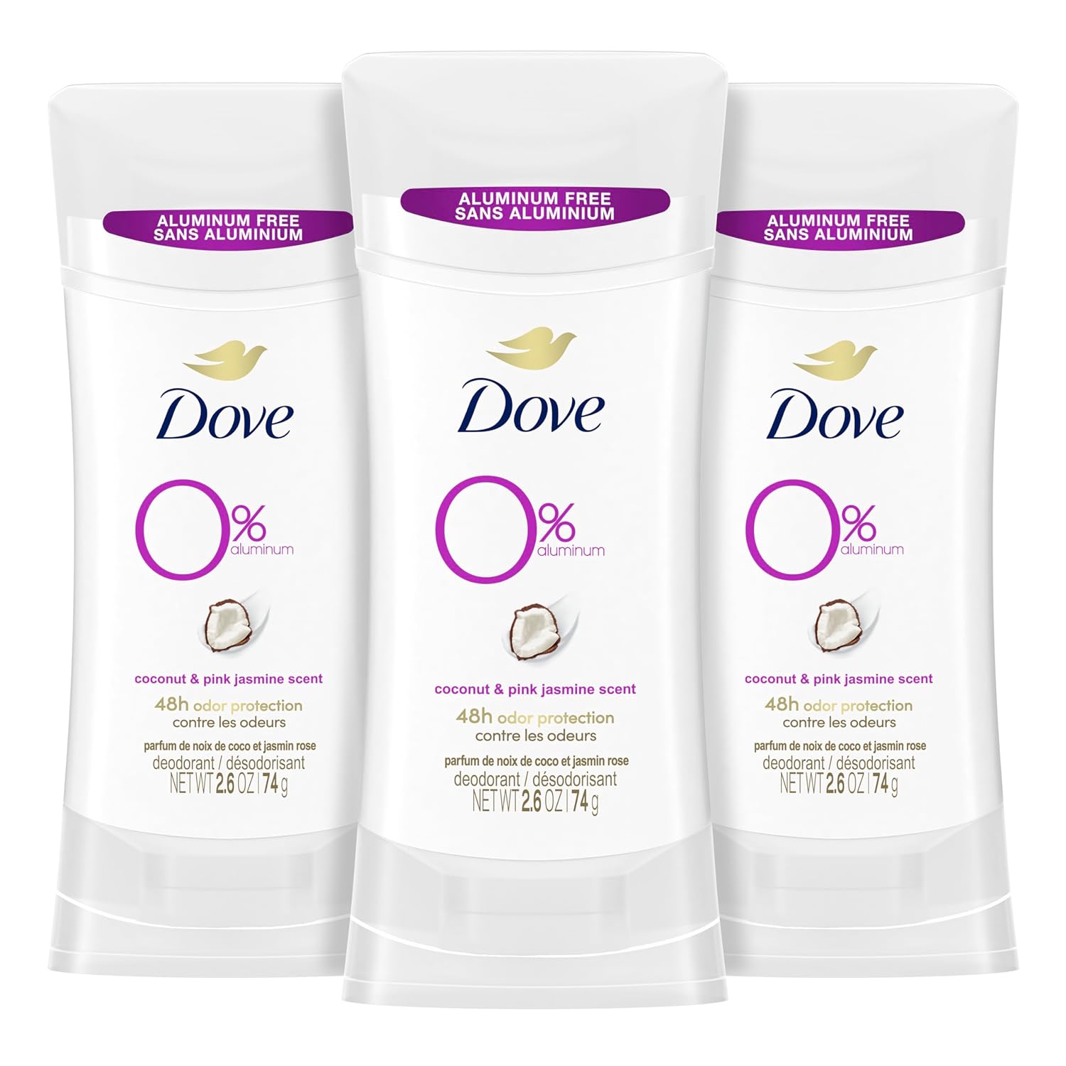 Dove 0% Aluminum Deodorant Stick Coconut and Pink Jasmine 3 Count Non-irritating Deodorant for Underarm Care Kindest Aluminum Free Deodorant 2.6 oz