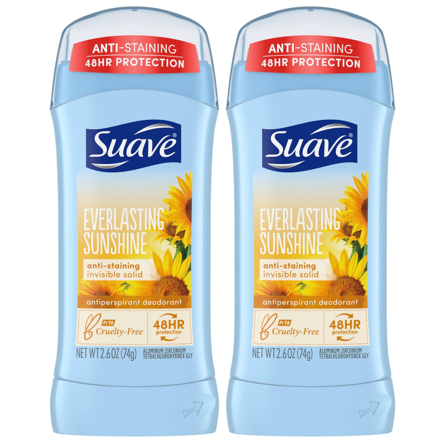 Suave Deodorant for Women, Everlasting Sunshine – Invisible Solid Antiperspirant Deodorant Stick, 48H Protection, Anti-Staining, Cruelty-Free, Scented, 2.6 Oz (Pack of 2)